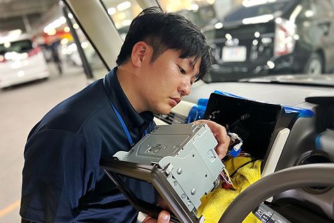 カーナビゲーション、ドライブレコーダー、ETC、バックカメラなどの電装品の取付け作業です。基本は決められた配線を繋いで、決められた場所にはめ込む作業。それぞれにマニュアルや取付説明書があるので、 接続方法などをひとつひとつの手順を確認しながら進めていく仕事です。